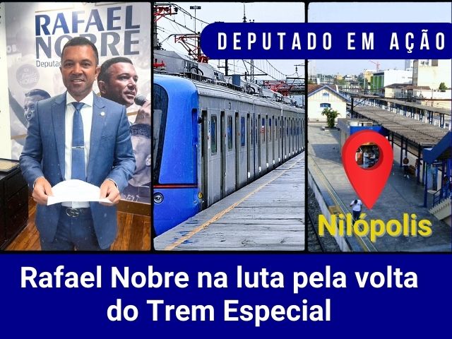 Em recente Indicação Legislativa (nº 2026/23), feita através do seu Gabinete na Assembleia Legislativa do Estado do Rio de Janeiro (ALERJ),  o Deputado Estadual Rafael Nobre está pleiteando a reativação do trem especial que fará o trajeto de Nilópolis para a Central do Brasil. Vale ressaltar que este é um anseio de todos aqueles que se beneficiavam deste trem expresso que partia de Nilópolis e que, infelizmente, foi interrompido. A referida  indicação foi dirigida ao Governador Cláudio Castro e à Secretaria de Estado de Transporte e Mobilidade Urbana.